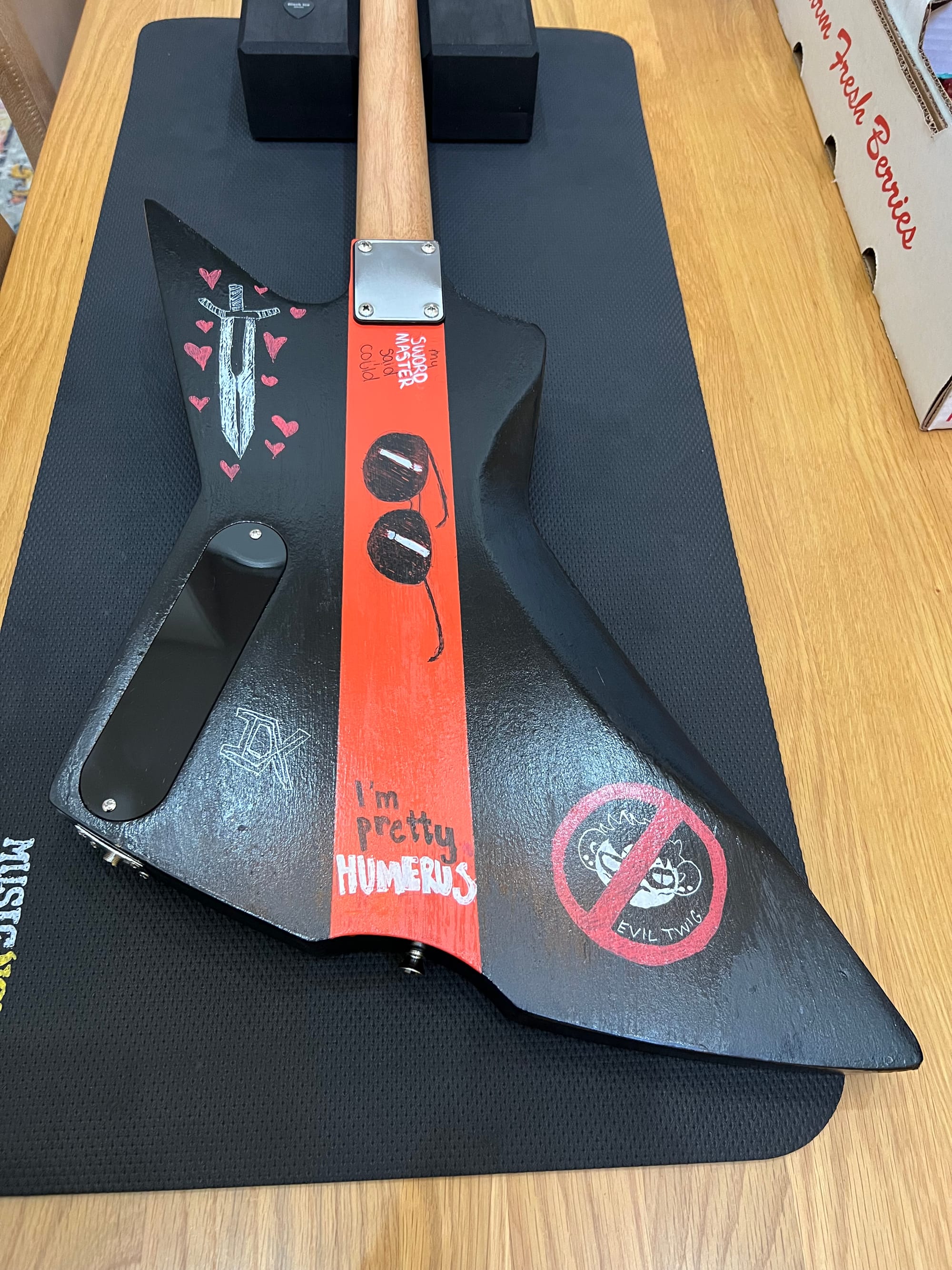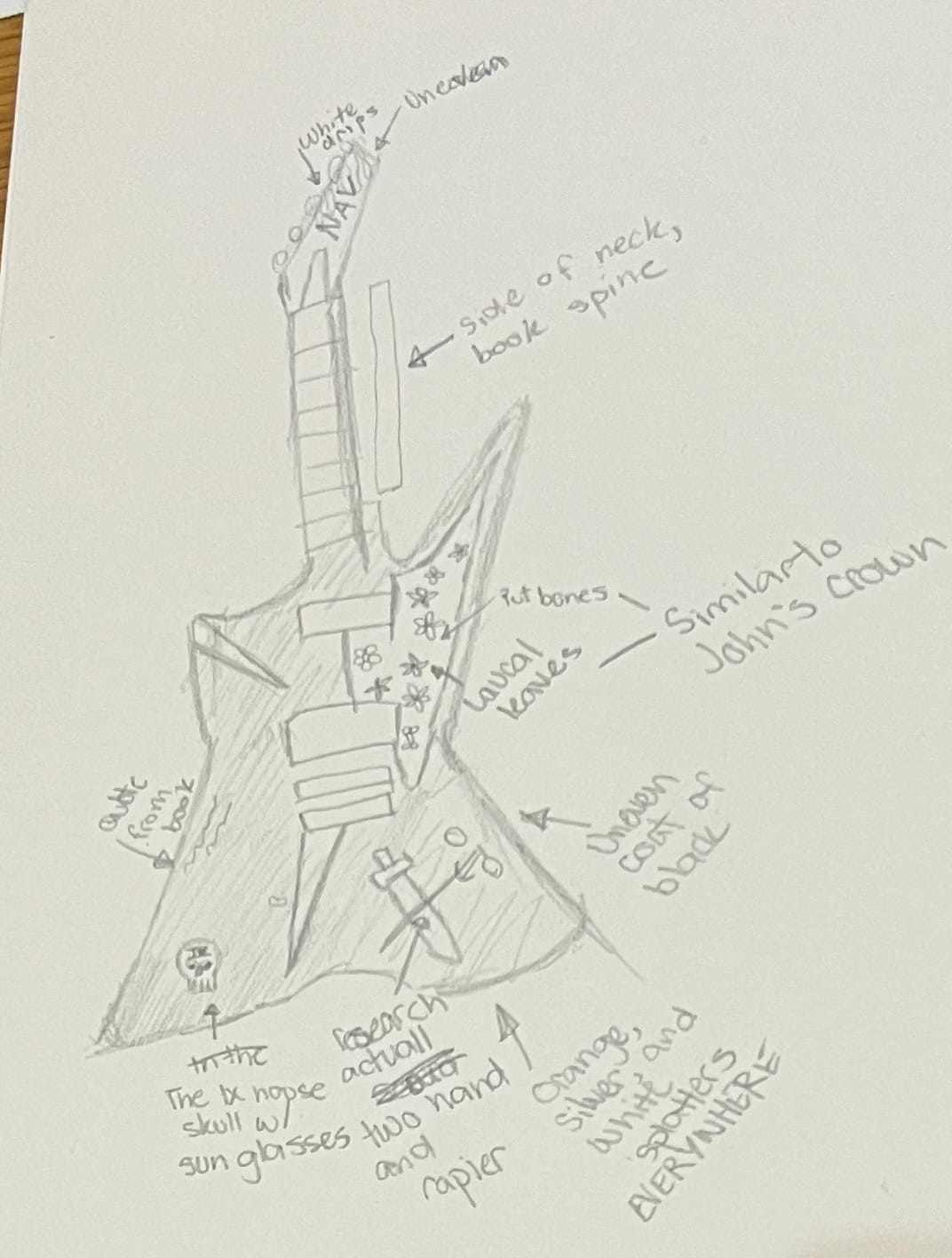 Around mid-April, I found the Harvey Benton guitar kits, and thought it'd be a fun project for the children and I. And it was! We decided on a Gideon the Ninth theme - a book I had loved since it came out, and the children had grafted onto as well. We designed, tested, failed, learned how to kind of spray paint things, tried again, and make a guitar that worked (that of course none of us could really play.)