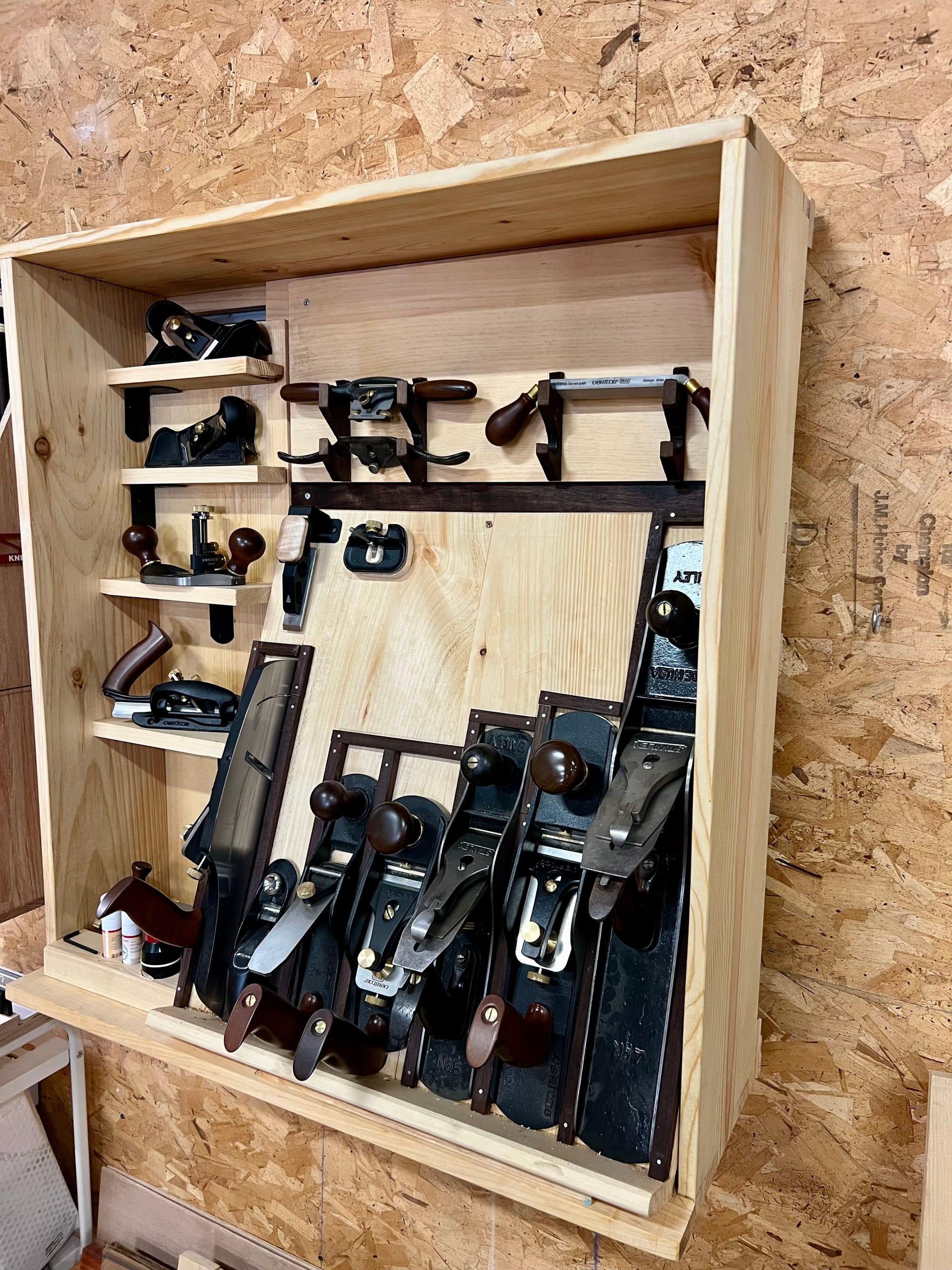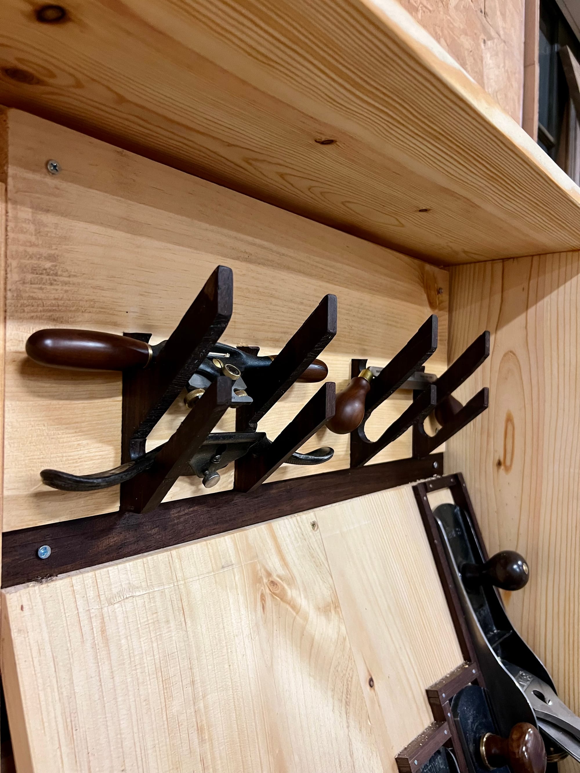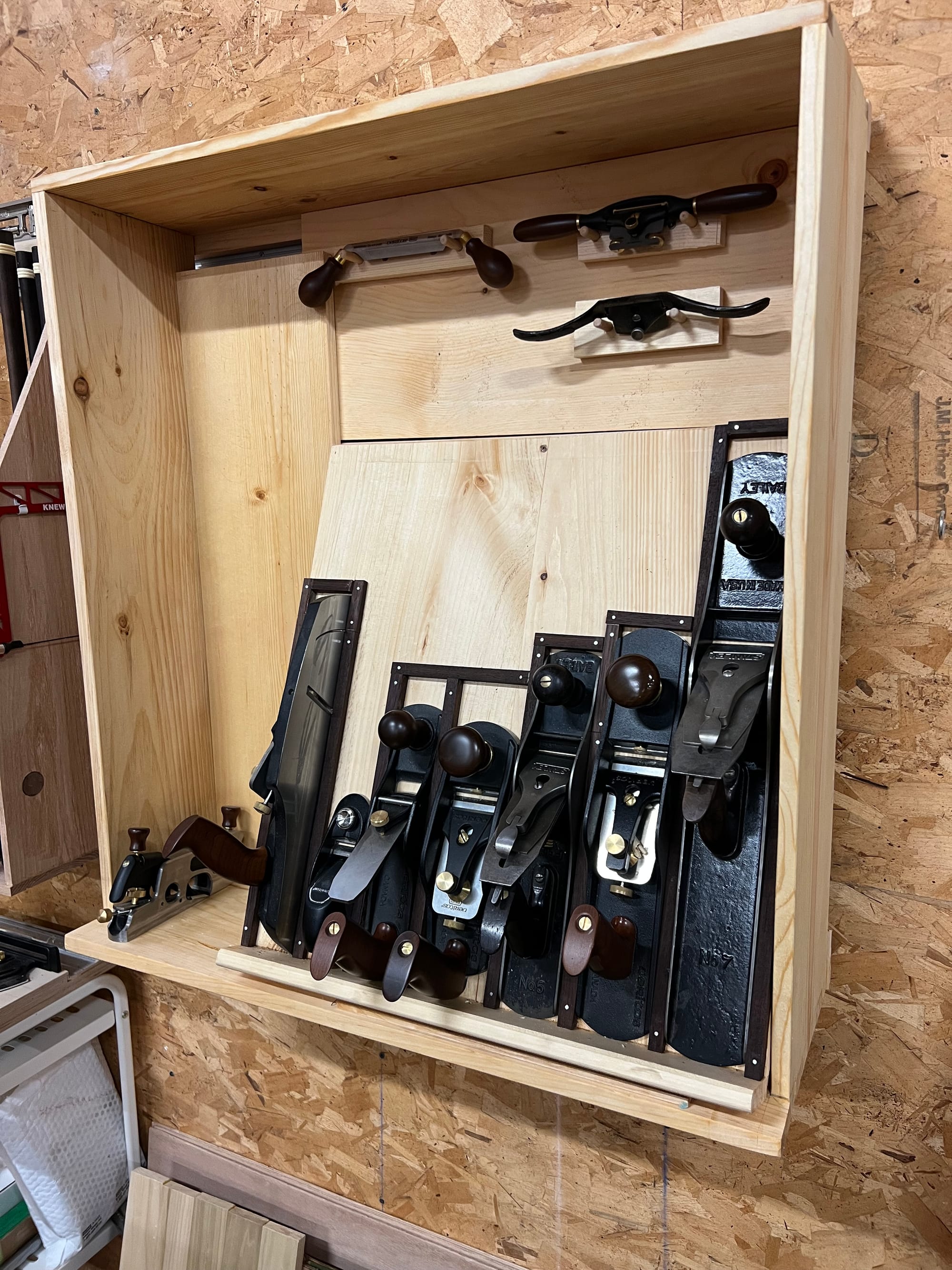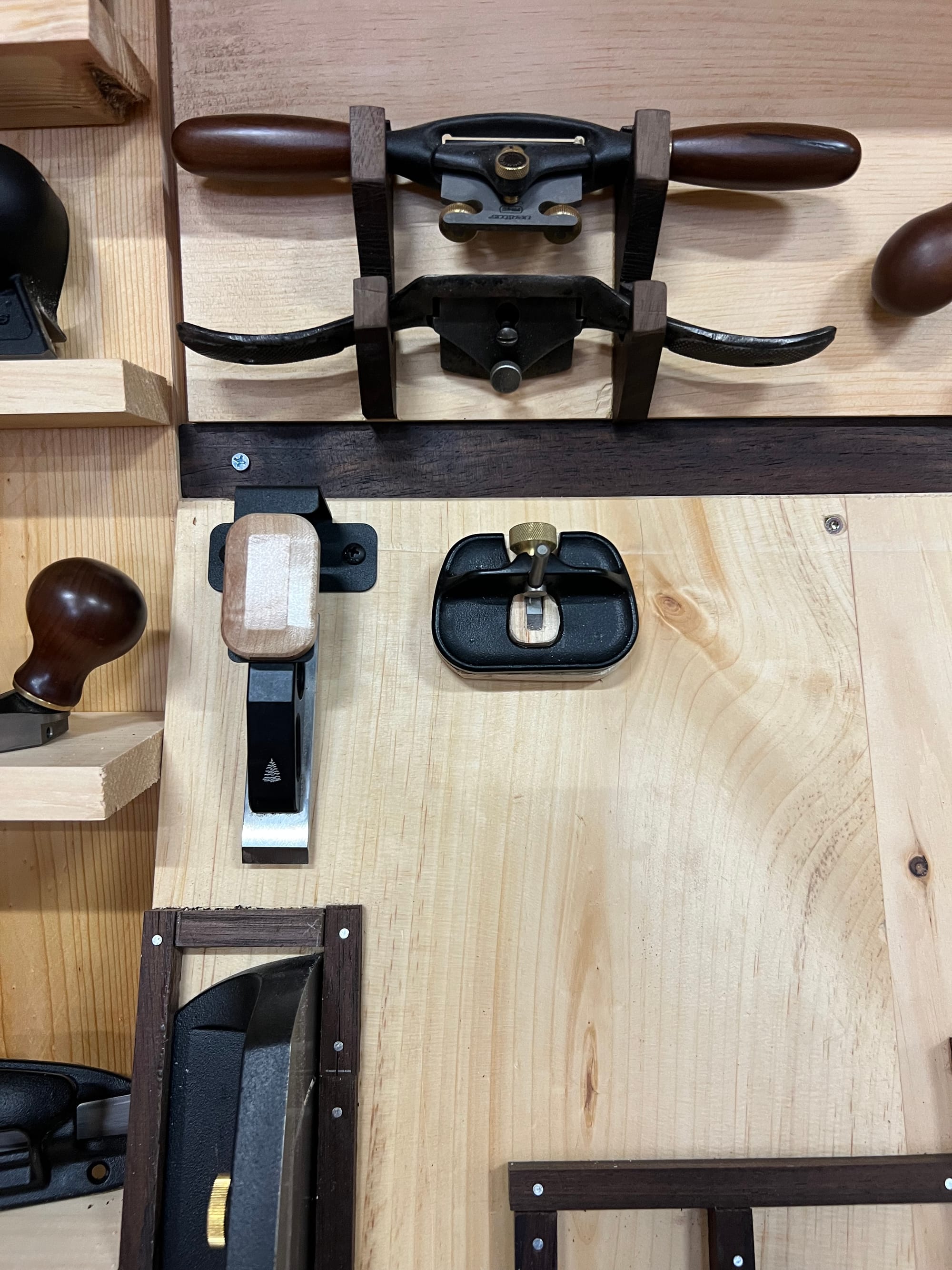 I also wanted to mount my spokeshaves and draw knife, so I bashed some temp holders together in a few minutes just to see what it might look like.