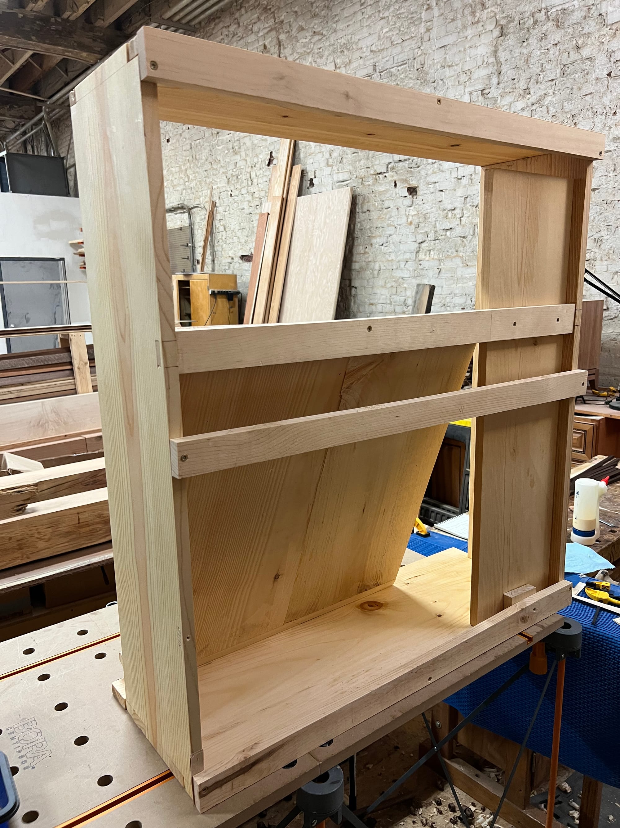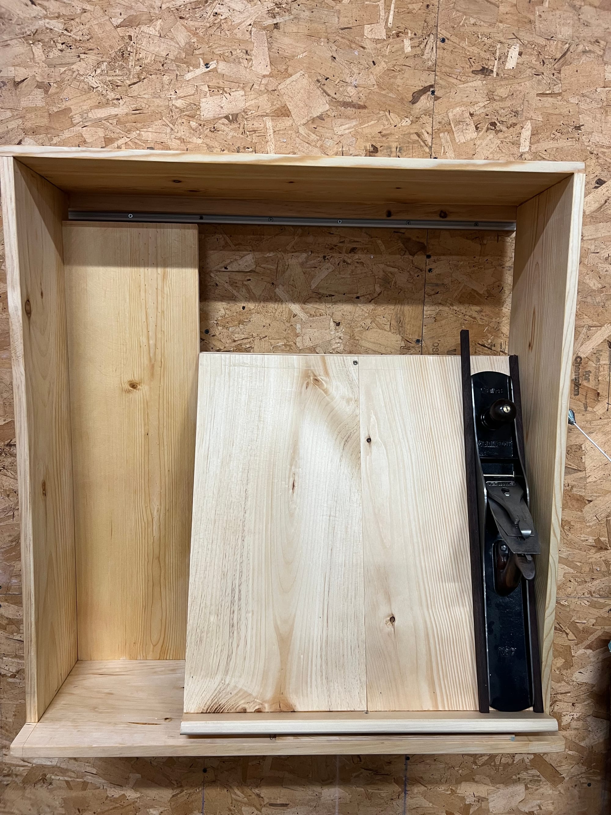 More dimensioning and fitting work, and it's starting to look like not the worst cabinet in the world. The till board itself is removable with two screws, so in theory at some point I could replace it with something nicer, or if my plane loadout changes, or whatever.