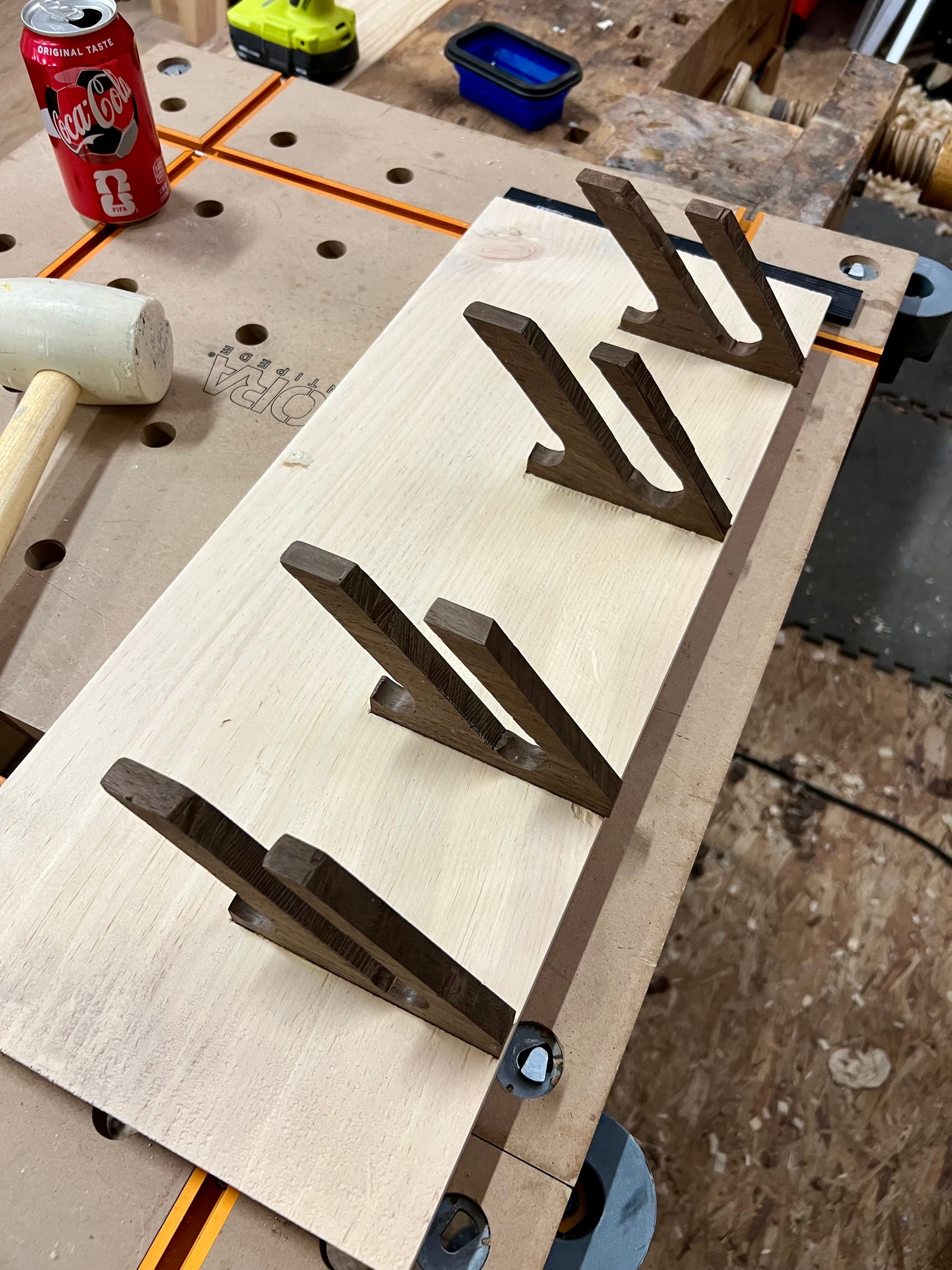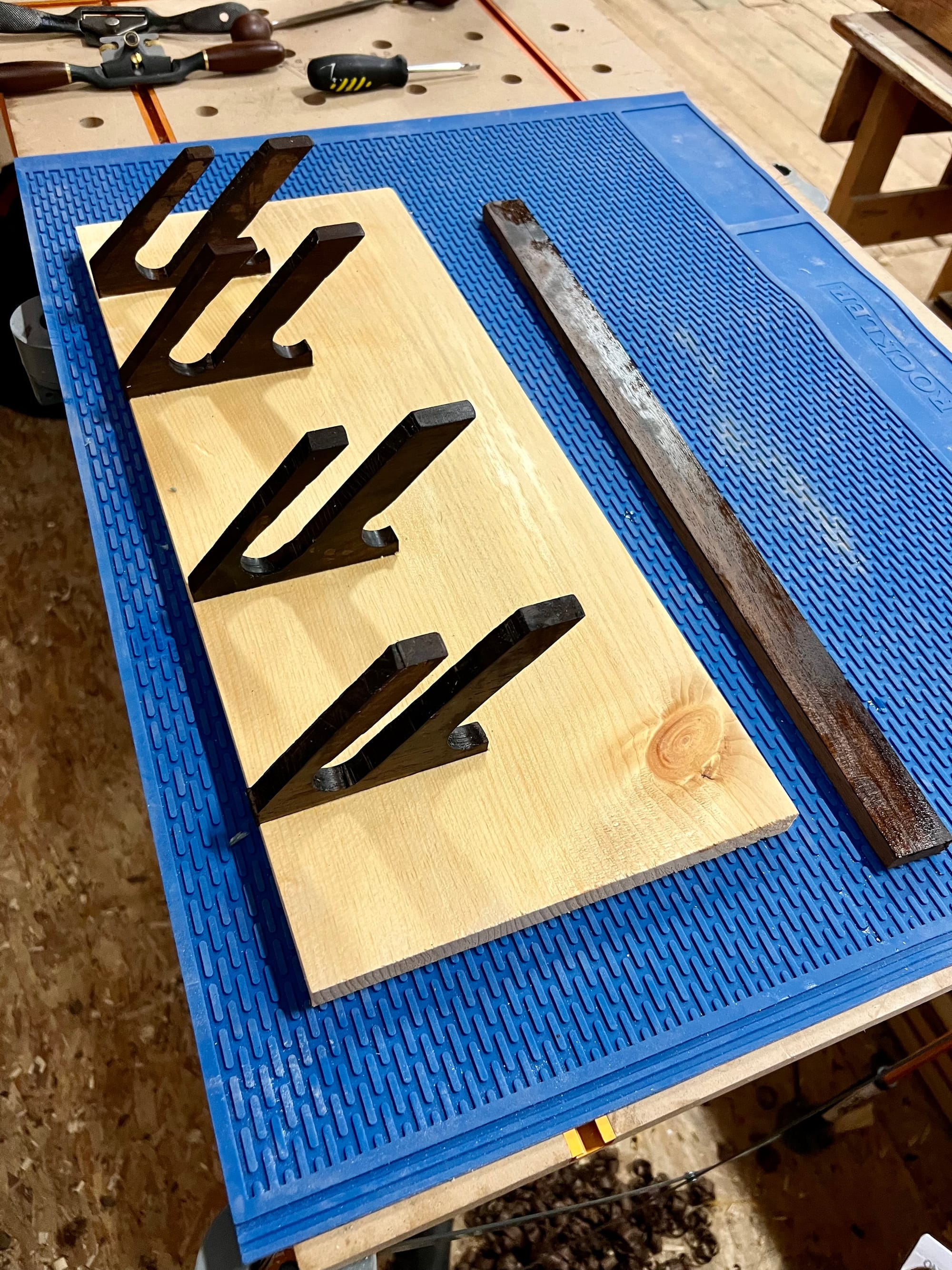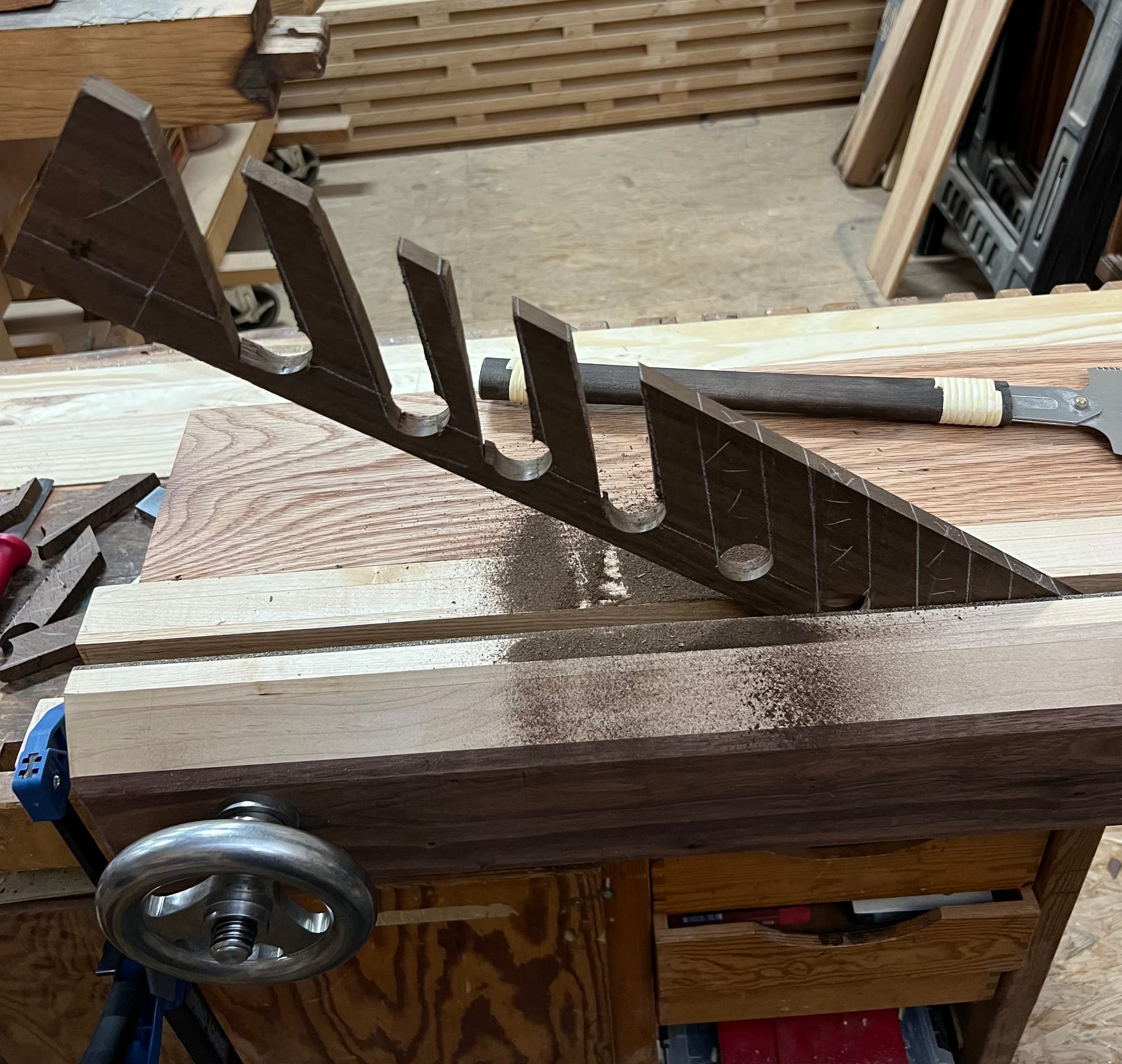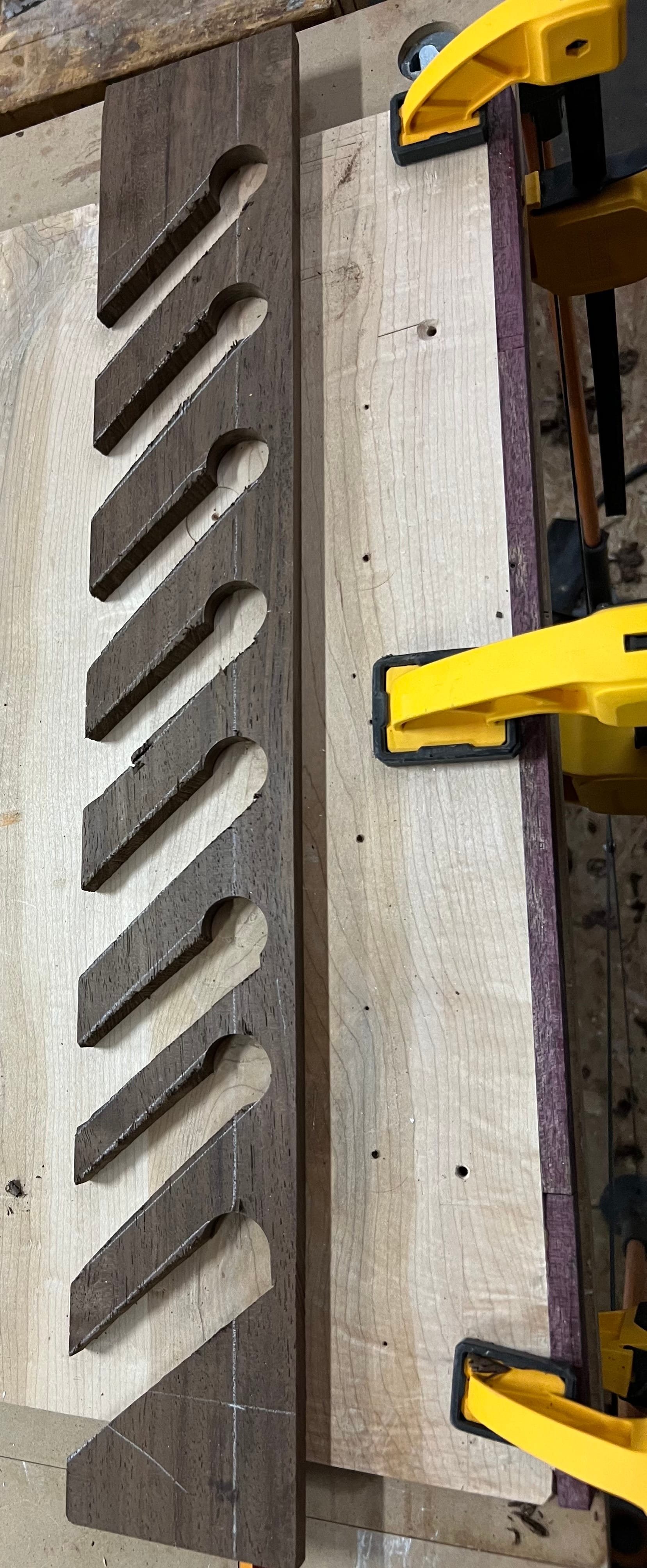 For the actual holders, I would make them out of more walnut, with some test pieces first. A huge mistake I made here was not paying attention to grain direction. With how the grain is facing, these are very prone to just snapping. Thankfully that didn't happen to me while sawing, and spokeshaves are quite light - but definitely a near miss.