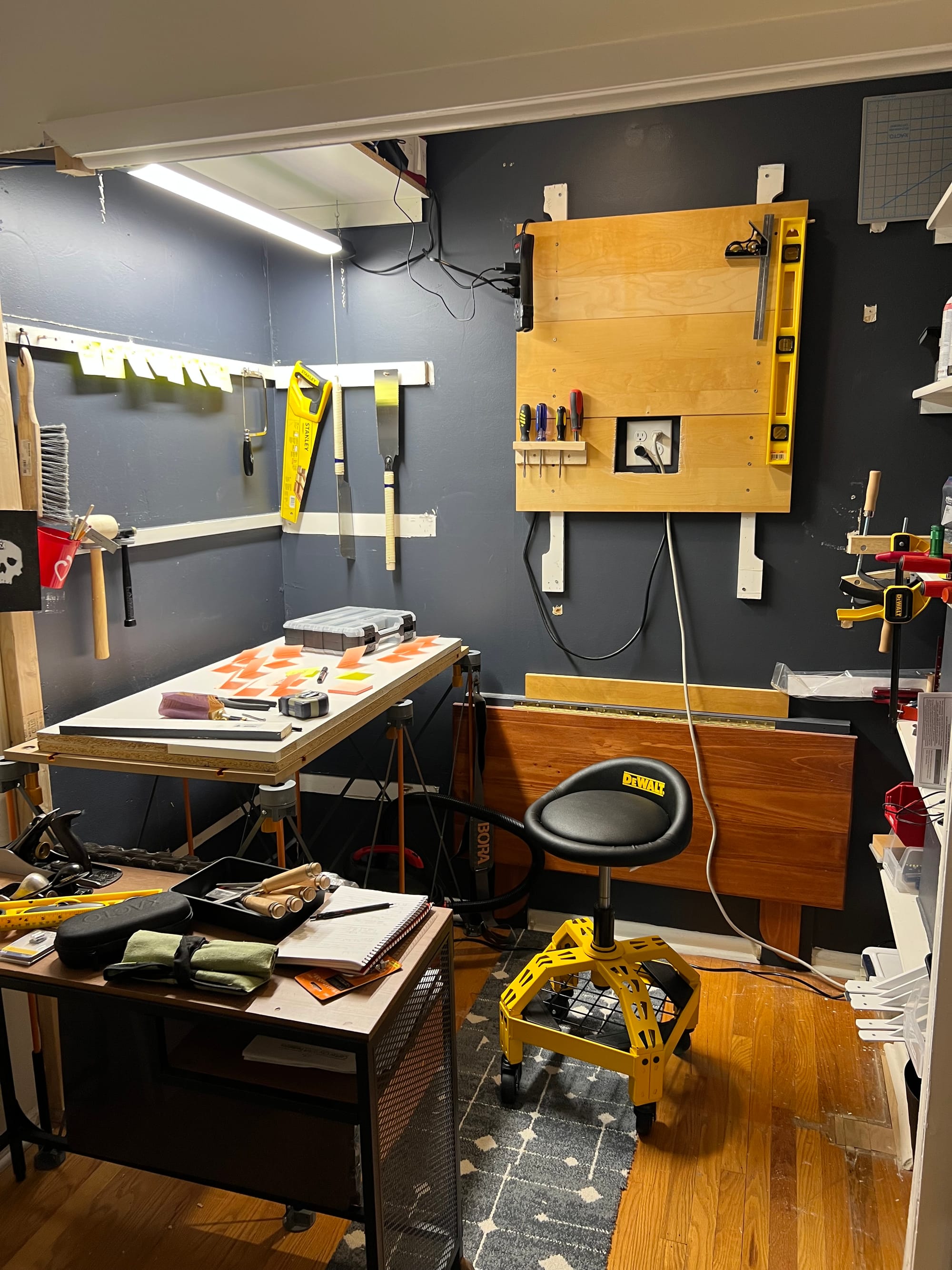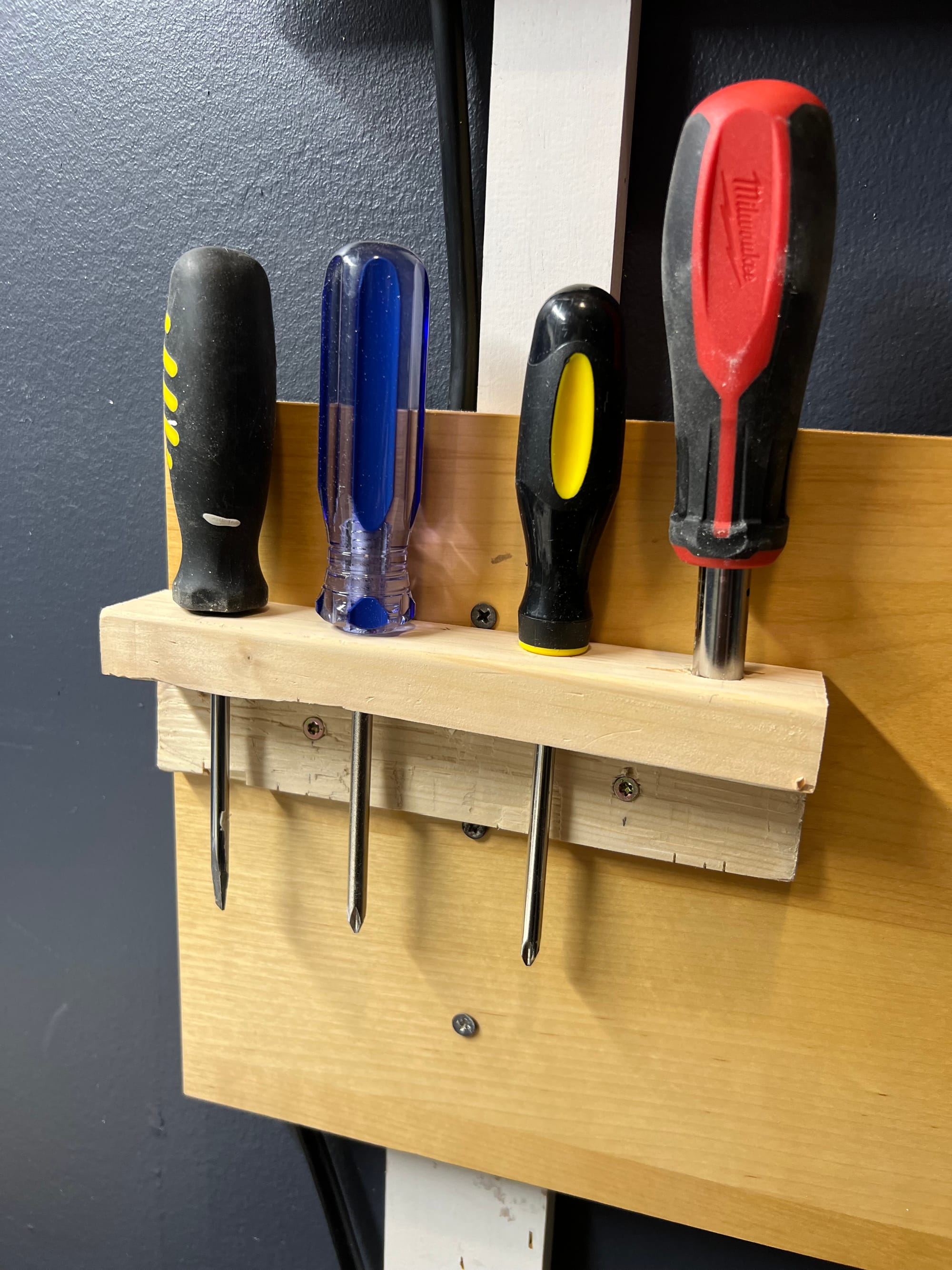 My first tool holder. Just a piece of wood and some holes in it. I had some spare 2x4 studs from ripping the office closet apart, so just used that.